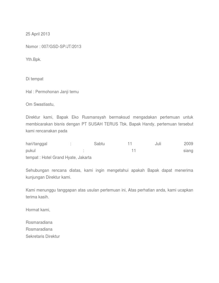 Isi surat tersebut adalah menanyakan kesanggupan bertemu pada pihak yang bersangkutan. Beberapa contoh surat rasmi permohonan temu janji yang baik dan benar 2019. Enter your comment here.