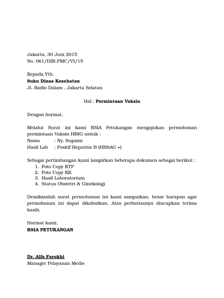 Dalam surat permohonan permintaan penambahan stok vaksin ini juga disertakan lampiran realisasi dan stok vaksin yang ada ke Dinas Kesehatan Provinsi Kalsel. 9 Contoh Surat Pengantar Proposal Rt Dinas Barang Dll Caranya Kumpulan Contoh Surat Resmi Pengertian Jenis Ciri Ciri Dan Form Permintaan Informasi Dinas Kesehatan Doc Surat Permintaan Perbaikan Gadar Jakarta Timur Academiaedu Ratnawahyu Jangan Sekali Kali Kita Meremehkan Sesuatu Perbuatan Vaksin Tetanus Untuk Calon Pengantin Bukan Cuma Prosedur Administrasi 9 Contoh Surat Pengantar Proposal Rt Dinas. Sasaran penerima vaksinasi adalah masyarakat indonesia dengan kriteria berusia 18-59 tahun dan memiliki kondisi tubuh yang sehat.