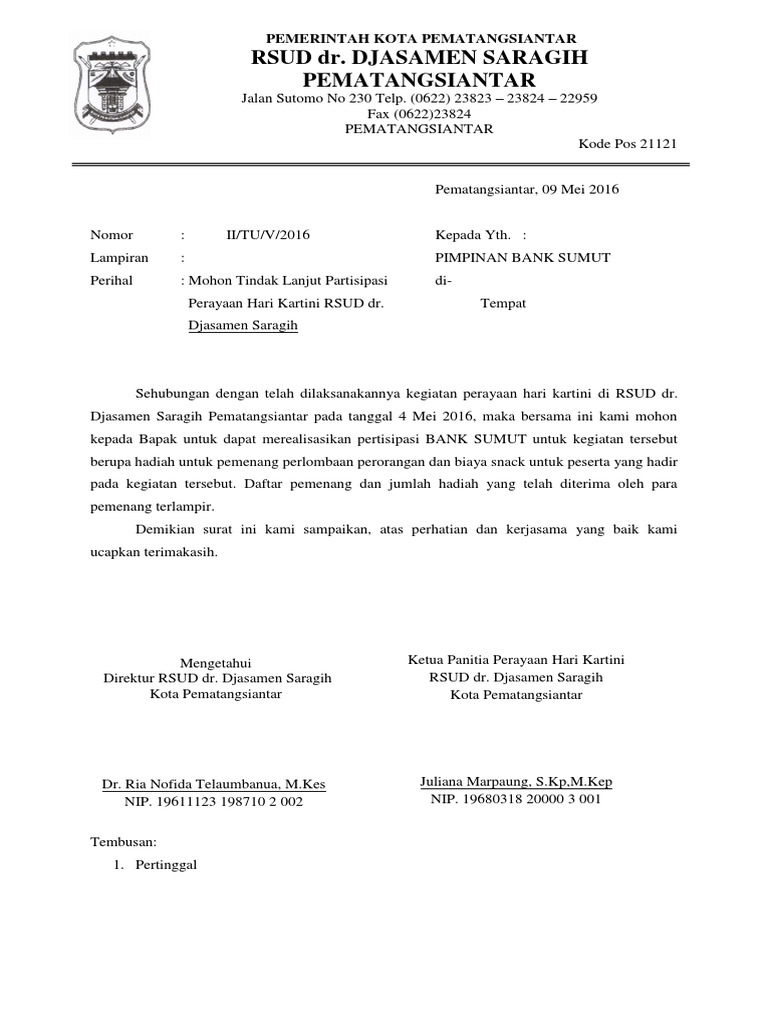 Karena sifatnya yang resmi bahasa yang dipakai dalam surat dinas haruslah baku dan menerapkan sistem formalitas. Surat Kartini kepada Nyonya Abendon 4 September 1901 Pergilah laksanakan cita-citamu. Contoh newsletter rumah sakit.